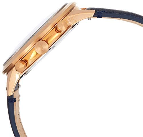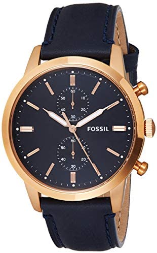 Define a dapper silhouette with the Fossil® Townsman watch. Rose gold-tone stainless steel case. Leather strap with adjustable buckle closure. Round face. Three-hand analog display with quartz movement. Navy dial features rose gold-tone hands and hour markers, two subdials, minute track, and Fossil detailing. Chronograph functionality. Water resistant 165 feet. Display case included. Imported. Measurements: Case Height: 44 mm Case Width: 44 mm Case Depth: 12 mm Band Width: 15 mm Band Circumference/Length: 10 1⁄2 in Weight: 2.5 oz