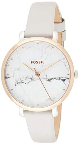 Watch Sizing GuideFind a sleek silhouette with the modern design of this Fossil® Jacqueline watch.Stainless steel case.Leather strap with adjustable buckle closure.Round face.Three-hand analog display with quartz movement.Dial features marble detailing, rose gold-tone hands and hour markers, and Fossil detailing.Water resistant.Display case included.Imported.This product may have a manufacturer's warranty. Please visit the manufacturer's website or contact us at warranty@support.zappos.com for full manufacturer warranty details.