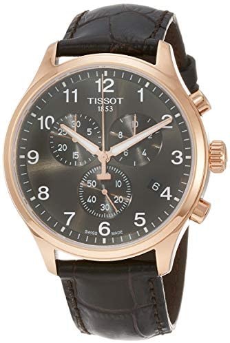 Complement your handsome visage with the bold elegance of the Tissot® Chrono XL Classic watch.Round 316L stainless steel case with rose gold PVD coating.Brown leather croc-embossed wrist strap. Traditional buckle closure.Luminous three-hand analog display with ETA G10.212 Swiss quartz movement, three sub-dials, and date display window.Chronograph functionality (30 minutes, 1/10 second, central 60-second chronograph hand, add and split functions).Black dial face features Arabic and stick indexes with a minute track at dial perimeter.Scratch-resistant sapphire crystal window.Water resistant 10 ATM/100 meters.Presentation box included.Swiss made.Measurements: Case Height: 45 1⁄7 mm Case Width: 45 1⁄7 mm Case Depth: 11 1⁄2 mm Band Width: 21 7⁄8 mm Band Circumference/Length: 9 in Weight: 2.8 oz