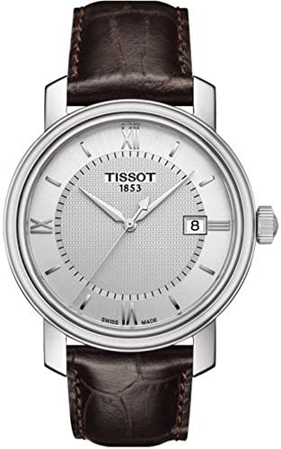 This gents Tissot Bridgeport watch is made from stainless steel and is fitted with a quartz movement. It is fastened with a brown leather strap and has a silver dial. The watch has a date function.