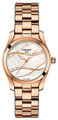 The Tissot T-Wave women's watch is powered by a quartz movement and is made from PVD coated rose coloured stainless steel case with sapphire crystal which measures 30mm wide and 8.7mm high. The watch with stainless steel strap and butterfly deployment clasp has a mother-of-pearl dial decorated with diamonds* and withstands up to 3 bar of water.