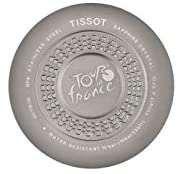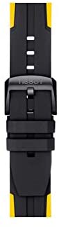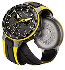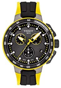 Special Edition for Tour de France 2019, Swiss Made Men's Chronograph for all Cycling Fans from the T-Sport Collection, Chronograph Quartz Movement ETA G10.212, Stopwatch with 30 Minutes and Tenth Seconds Counter, Central 60 Seconds Chronograph Hand, Add and Split Functions to Measure Partial and Split Times, Black/Anthracite Dial, raised India. zes, display of hour, minute, decentralised second, date, luminescent hands and markers, case made of satin 316L stainless steel, grey PVD coated, engraved case back, black and yellow coated aluminium bezel with tachymeter scale, sapphire glass, black/yellow silicone strap, matt black stainless steel pin buckle, waterproof up to a pressure of 10 bar, diameter 44.5 mm, height 1.5 mm. 4 mm.
