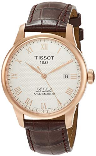 Silver dial enhanced by rose gold-tone leaf-style shape hands. Rose Gold PVD stainless steel case with a brown leather band. Automatic movement. 30 meters / 100 feet water resistance. Fixed bezel. Scratch Resistant Sapphire crystal. Transparent caseback. Butterfly clasp. Pull / Push crown. Case size 39.3 mm x 9.75 mm. Band 19 mm x long. Tissot T006.407.36.033.00 Le Locle Watch.