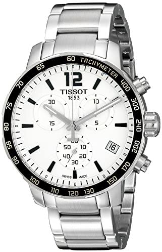 This gents Tissot Quickster watch is made from stainless steel and is powered by a chronograph quartz movement. It is fastened with a silver metal bracelet and has a white dial. The watch has a date function.