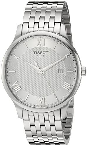 This gents Tissot Tradition watch is made from stainless steel and is fitted with a quartz movement. It is fastened with a silver metal bracelet and has a silver dial. The watch also has a date function.