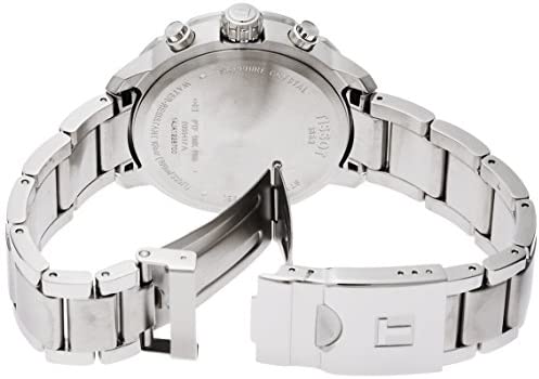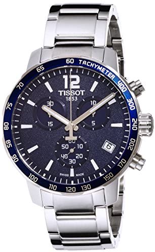 This men's Tissot Quickster watch has a stainless steel case and is fitted with a chronograph quartz movement. It is fastened with a silver metal bracelet and has a blue dial. The watch has a date function.