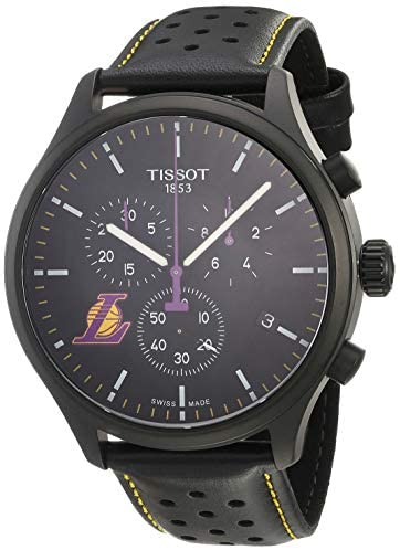 Make a fast break to the net for an easy basket with the slam-dunk style of the Tissot® Chrono XL NBA Chronograph L.A. Lakers watch.Round 316L stainless steel case with black PVD.Perforated black leather strap with team colors (yellow contrast stitching, underlying purple seen through strap perforations).Traditional buckle closure.Luminous three-hand analog display with ETA G10.212 Swiss quartz movement, three sub-dials, and date display window.Chronograph functionality (30 minutes, 1/10 second, central 60-second chronograph hand, add and split functions).Black dial face features stick indexes, minute track at dial perimeter, and primary team color accents (yellow and purple).Scratch-resistant sapphire crystal window.Integrated crown protection.Water resistant 10 ATM/100 meters.Presentation box included.Swiss made.Measurements: Case Height: 44 2⁄5 mm Case Width: 44 2⁄5 mm Case Depth: 11 1⁄10 mm Band Width: 21 3⁄5 mm Band Circumference/Length: 10 in Weight: 2.6 oz