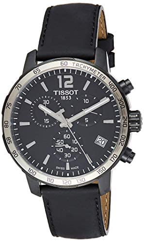 This attractive men's Tissot Quickster watch has a black ion-plated steel case and is powered by a chronograph quartz movement. It is fitted with a black leather strap and has a black dial. The watch also has a date function.