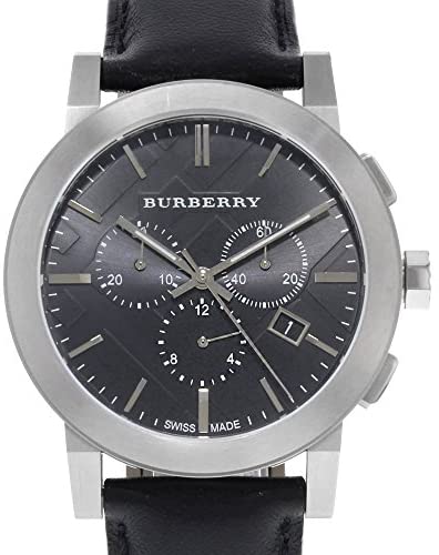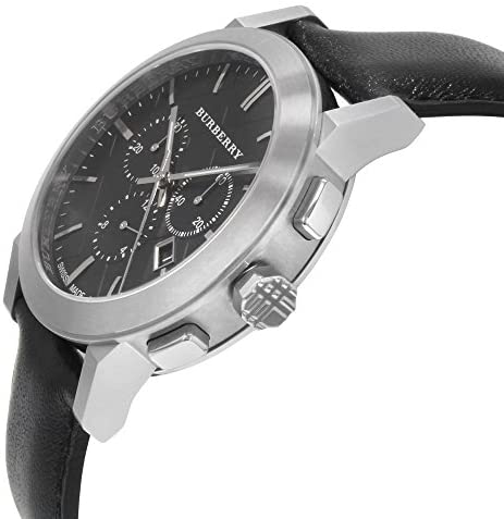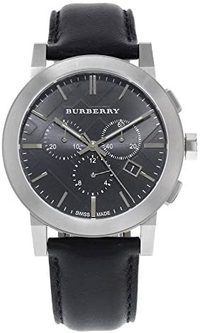 Brushed stainless steel case (42 mm in diameter, 11 mm thick), Screw-in case-back, Black dial with Burberry check motif and signature logo, Silver-tone luminescent hands, Silver-tone indices, Date window at the 4 o'clock position, Small seconds sub-dial at the 3 o'clock, Chronograph function includes a sweep seconds hand, 30 minute at the 9 o'clock position and 12 hour counter at the 6 o'clock position, Scratch resistant sapphirel crystal, Swiss quartz movement, Water resistant to 5 ATM/50 meters/165 feet, Black leather strap, Pin buckle, Model number: BU9356.