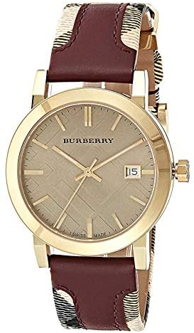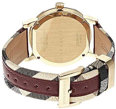 ORIGINAL BURBERRY UNISEX WATCH BU9017 YEAR: 2012 CASE: GOLDEN PLATED STAINLESS STEEL SHUT: BUCKLE STRAP: BURBERRY PRINT AND RED LEATHER FUNCTIONS: HOUR-MINUTE-SECOND-DATA WARRANTY: 2 YEARS INTERNATIONAL WATERPROOF: 50 MT SIZE: 38x9 mm MOVEMENT: QUARTZ NEW: YES DIAL: GOLD TONE GLASS: SAPPHIRE