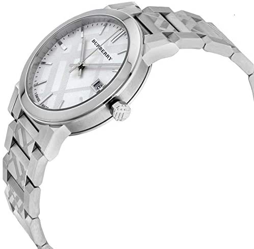 This men's Burberry The City Engraved Check watch is made from stainless steel and is powered by a quartz movement. It is fitted with a silver metal bracelet and has a silver dial. The watch also has a date function.