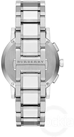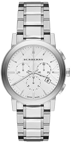Stainless steel case with a stainless steel bracelet. Fixed stainless steel bezel. Silver check stamped dial with silver-tone hands and index hour markers. Minute markers around the outer rim. Dial Type: Analog. Date display at the 4 o'clock position. Chronograph - three sub-dials displaying: 60 second, 30 minute and 12 hour. Quartz movement. Scratch resistant mineral crystal. Pull / push crown. Solid case back. Case diameter: 38 mm. Round case shape. Band width: 20 mm. Fold over clasp. Water resistant at 50 meters / 165 feet. Functions: chronograph, date, hour, minute, second. Casual watch style. Burberry City Chronograph Silver Dial Stainless Steel Ladies Watch BU9750.