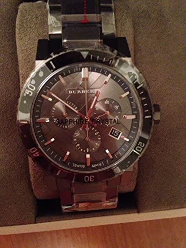 This attractive gents Burberry The City watch is made from black ion-plated steel and is powered by an analogue chronograph quartz movement. It is fastened with a grey metal bracelet and has a black dial. The watch also has a date function.