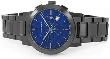 This men's Burberry The City watch is made from black ion-plated steel and is fitted with a chronograph quartz movement. It is fastened with a black metal bracelet and has a blue dial. The watch has a date function.