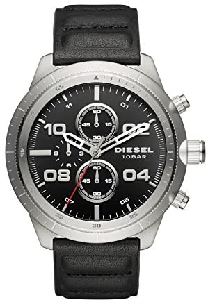 Product DescriptionGo off the beaten path with the Diesel Padlock watch, new for Spring 2017. The stainless-steel case features a rachetting topring with compass-inspired case details, complemented by a black chronograph dial with silver indexes. A black leather strap completes the look.Box ContainsWatch, packaging, and care instruction booklet