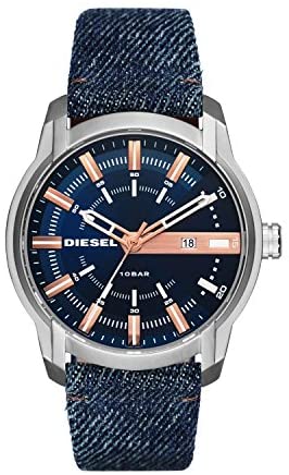 Product DescriptionPack a punch in the DIESEL armbar watch. A detail packed blue dial is accented with rose gold and white indexes, a date window, and a stainless steel case. A distressed denim strap finishes the look.Box ContainsWatch, packaging, and care instruction booklet