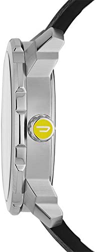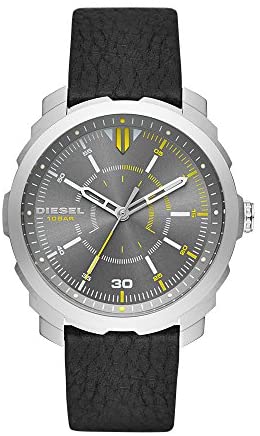 A grey dial with yellow and white accents adds a futuristic feel to the Diesel Machinus watch. The stainless steel case textured black leather strap complete the look.