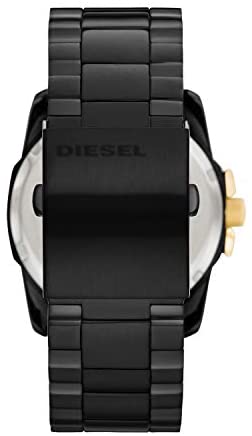 Adding to Diesel's progressive platform, this watch features a unique case shape and a sleek, black dial with gold-tone accents. A date window adds functionality, while the stainless steel bracelet and case are brushed with black ionic plating to complete the look.