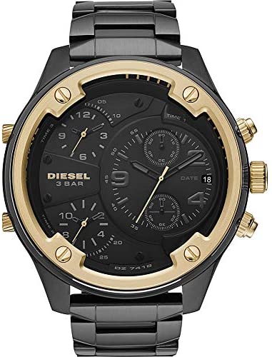 Watch Sizing GuideThe big interview day is finally here, you've prepped and you're prepared to nail it in this Diesel® Boltdown - DZ7418 confidence booster! Stainless steel case.Stainless steel bracelet with fold-over clasp and double-safety closure. Round face.Three-hand analog display with quartz movement.Dial features brilliant black dial, tonal hands and hour markers, multi-faceted subdials, date display window, minute track, and Diesel detailing.Chronograph functionality.Water resistant up to 100 feet.Display case included.Imported.Measurements: Case Height: 55 mm Case Width: 55 mm Case Depth: 14 mm Band Width: 26 mm Band Circumference/Length: 10 in Weight: 7.6 oz