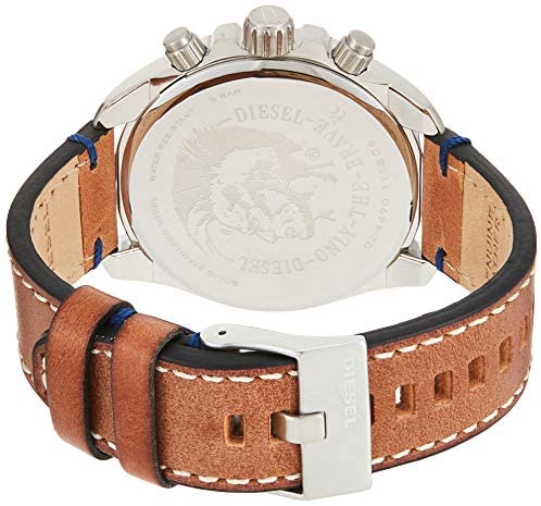 Watch Sizing Guide Stack up higher than the rest with this bold and efficient Diesel® MS9 Chrono watch. Stainless steel case. Leather strap with adjustable buckle closure. Round face. Three-hand analog display with quartz movement. Dial features black-tone hands and hour markers, three subdials, date display window, minute track, and Diesel detailing. Chronograph functionality. Water resistant 5 BAR. Display case included. Imported. Measurements: Case Height: 47 mm Case Width: 47 mm Case Depth: 13 mm Band Width: 21 mm Band Circumference/Length: 9 1⁄4 in Weight: 3.2 oz
