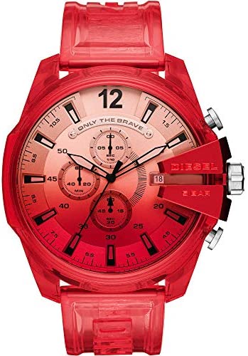 Brand Name Diesel Model number DZ4534 Part Number DZ4534 Model Year 2020 Item Shape Round Dial window material type Mineral Case material Stainless Steel Case diameter 44 millimetres Band length Men's Standard Band width 22 millimetres Band Color Red Bezel material Stainless Steel Movement Quartz Display Type Analog