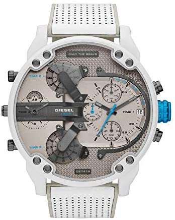 Product DescriptionThis 57mm Mr. Daddy 2.0 watch features a detailed grey dial, chronograph movement and white-and-grey leather and silicone strap.Box ContainsWatch, packaging, and warranty booklet