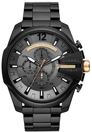 Product descriptionCommanding and stylish, this black IP Diesel Mega Chief watch features a gray chronograph dial with an “Only the Brave” tag and three-link bracelet.Box ContainsWatch, packaging, and warranty booklet