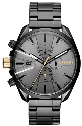 Product descriptionDiesel presents this stunning mens chronograph bracelet watch, ideal for giving your outfits a fashion forward edge. The gunmetal grey steel design features a round grey dial with seconds indices, luminescent hands, chronograph sub-dials, date window and baton hour markers. Complete with suave gold tone detailing and a masculine bracelet. - Case Width: 47mm - Watch Movement: Quartz - Water Resistant: 50 metresBox ContainsWatch, packaging, and warranty booklet