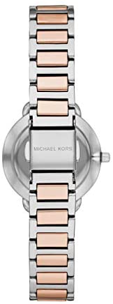 Michael Kors Women's Only Time Watch from the Portia Collection. Watch with round shape stainless steel case in silver colour with polished finish. Case size: 28 mm. Case thickness: 7 mm. Stainless steel ferrule in satin silver. Quandrate colour: White. Clear glass Stainless steel bracelet silver and rose gold with polished finish and fold-over clasp. Bar distance: 12 mm. Watch with crystals on dial. 5 ATM water resistance. Quartz movement with 3 balls. The reference is Mk4453