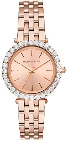 Michael Kors women's only time watch from the Darci collection. Model with round stainless steel case in rose gold colour with polished finish. 16 mm diameter case and 7 mm thickness. The dial is rose gold colour with clear glass. The ring is made of stainless steel in rose gold colour with floor finish. The watch has crystals on the dial. The strap is made of stainless steel in rose gold colour with polished finish and clasp: Deployable. The distance of the bars is 16 mm. Water resistance is 5 ATM. Quartz movement watch with 3 hands. The reference is Mk4514.