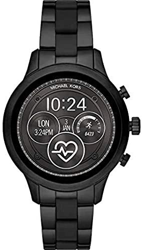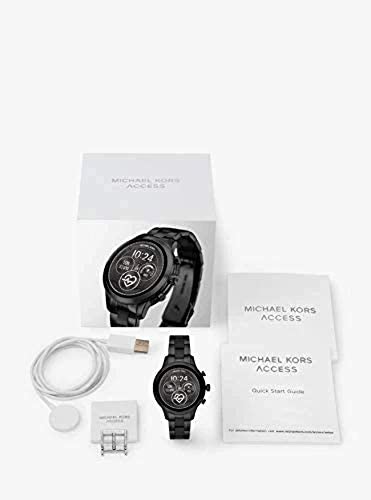 Product DescriptionThe iconic Runway is back and better than ever in an innovative smartwatch design. In black steel, this Michael Kors Access style offers a new highly personalised experience with heart rate tracking, swimproof technology, NFC payments, GPS functionality and more. Customise the full-round display with new digital dial designs that connect to and visually show your heart rate, receive notifications (on the go) and automatically track your activity from the sidewalk to the gym. Smartwatches built with Wear OS by Google™ are compatible with iPhone and Android™ phones. Wear OS by Google and other related marks are trademarks of Google LLC. Touchscreen smartwatches built with Wear OS by Google require a phone running Android OS 4.4+ (excluding Go edition) or iOS 9.3+. Supported features may vary between platforms.Box ContainsWatch, Wireless Charger (USB Type), Quick Start Guide
