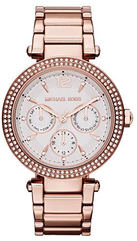 This watch by Michael Kors Parker distills a jet-set style with a rose gold bracelet and a sphere decorated with pavé crystal.