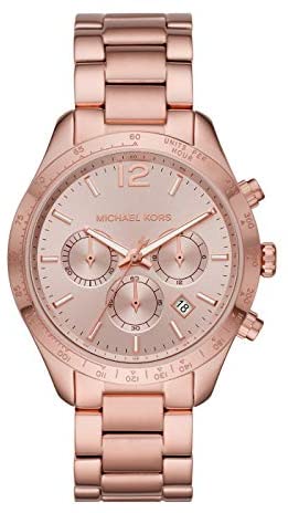 Michael Kors Women's Chronograph Watch from the Layton Collection. Model with round stainless steel case in rose gold colour with polished finish. 42 mm diameter case and 10 mm thickness. The dial is rose gold colour and transparent glass. The ring is made of stainless steel in rose gold colour with satin finish. The strap is made of stainless steel in rose gold colour with polished finish and clasp: Deployable. The distance of the bars is 20 mm. Water resistance is 5 ATM. Quartz movement.