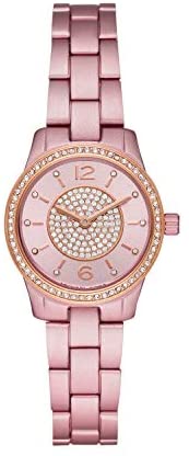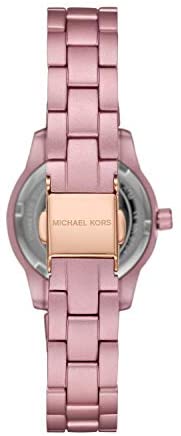 Michael Kors' Runway 28 mm watch features a pink dial with a glitz centre and rose gold-tone stick and numeral indexes, two-hand movement and pink aluminium bracelet.