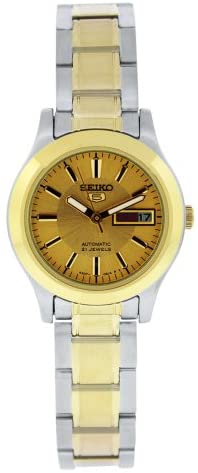 Seiko 5 collection. Two tone stainless steel case and link bracelet. Push button deployment clasp. Gold tone dial has luminous hands and hour markers. Day and date display. Water resistant. Scratch resistant Hardlex crystal. Precise 21 jewel self-winding Automatic movement. Case measures 25mm diameter by 10mm thick.