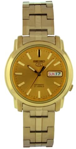 Seiko 5 Collection. 21 Jewels Self-winding automatic movement. Gold tone stainless steel case and bracelet. Silver tone dial with luminous hands and hour markers. Day and date display. See through case back. Push-button deployment clasp. Water resistant to 30m. Scratch resistant Hardlex crystal. Case measures 36mm diameter by 11mm thick. SNKK76