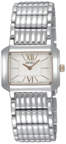 This attractive ladies watch from Seiko has a square white dial with a mix of baton and Roman numeral markers. It is set in a stainless steel case with a ribbed link bracelet.