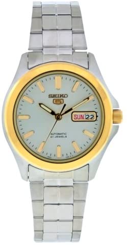 Seiko 5 collection. Two tone stainless steel case. Link bracelet with push-button deployment clasp. Silver tone dial with luminous gold tone hands and hour markers. Day and date display. See through case back. Water resistant to 30m. Scratch resistant Hardlex crystal. Precise Automatic movement. Case measures 38mm diameter by 12mm thick. SNKK96