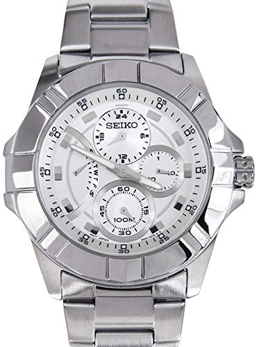Seiko mens watch. Silver stainless-steel case and silver Stainless Steel strap. White dial. Quartz movement. Deployment clasp closure. Water resistance of 100 meters.