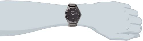 Dress watch, Solar-powered movement, Overcharging prevention feature, Polished silver-tone dauphine hands, Polished silver-tone sweep seconds, Twelve genuine diamond hour markers, Analog date aperture near three o'clock position, Two-layered brushed black dial with matte silver-tone logo applique below twelve o'clock position, Polished black-ion-plated stainless steel bracelet with adjustable links and push-button-clasp, Polished black-ion-plated stainless steel bezel, Polished black-ion-plated stainless steel round case, Polished black-ion-plated steel crown, Stainless steel caseback, Hardlex crystal, 5 ATM (50 meters/165 feet water resistant)