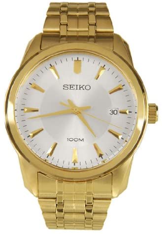 A Classic timepiece brought to you by Seiko Watches. Brushed and polished gold tone stainless steel case. Comfortable stainless steel link bracelet with fold over deployment clasp. Silver tone dial with gold tone hands and hour markers. Date display at the sixth hour. Precise Quartz movement. Scratch resistant Hardlex crystal. Water resistant to 100m. Case measures 40mm diameter by 10mm thick.