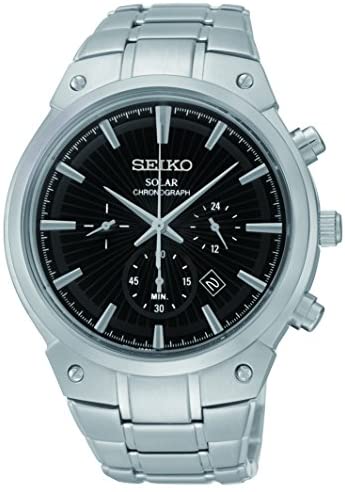 Seiko SSC317 Core Solar chronograph men's watch features a 43mm wide and 12mm thick solid stainless steel case with a fixed bezel and textured screw down crown with function pushers. Seiko SSC317 is powered by light energy with an accurate Japanese V175 solar quartz chronograph movement. This stylish watch also features a textured black dial with silver tone luminous hands and index hour markers along with the chronograph, 6-month power reserve once fully charged function, 12/24-hour time and date display functions, scratch resistant hardlex crystal and water resistant to 100 meters. Seiko SSC317 is equipped with a 22mm wide solid stainless steel bracelet with a fold over push button clasp. Seiko SSC317 men's Core Solar chronograph black textured dial steel bracelet watch is brand new and comes in an original Seiko gift box and is backed by a 3 years for USA and 1 year international limited warranty.