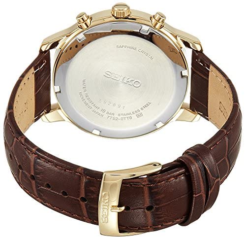 Features:<br/>Chronograph Watch<br/>- Analogue display hours, minutes, seconds<br/>- Date display<br/>- 24 hour display<br/>/Stop function<br/>- Lumibrite<br/>- Sapphire glass<br/>- Waterproof 10 ATM water resistance<br/>Housing<br/>Stainless Steel with Gold Plating<br/>- Bolted back case<br/>- Diameter 44 mm, height: 10 mm.<br/>Bracelet with Clasp<br/>Triple leather bracelet<br/>- Buckle<br/>Technology<br/>Quartz clock movement<br/>- Calibre 7T92<br/>Box Contents<br/>- Watch<br/>- User Instructions<br/>Original Seiko watch box