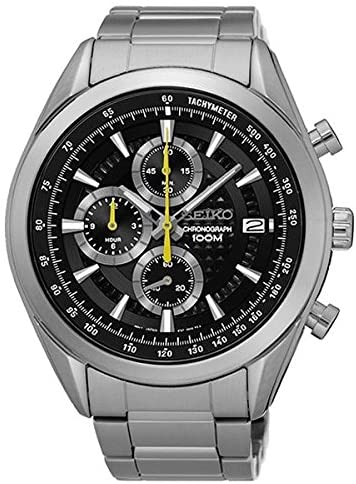Seiko mens watch. Silver stainless steel case Black dial. Japanese Quartz movement. Double Locking Fold-over Clasp closure. Water resistance of 100 meters.