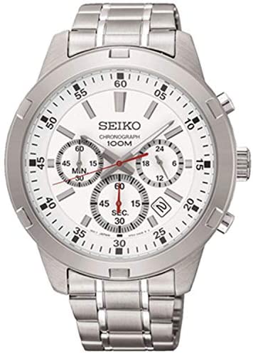 Seiko mens watch. Silver stainless steel case White dial. Quartz movement. Deployment Buckle closure. Water resistance of 100 meters.