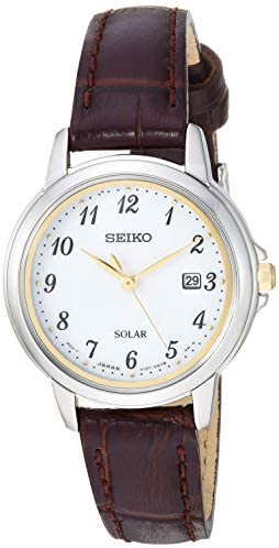 Silver-tone stainless steel case with a brown leather strap. Fixed bezel. White dial with gold-tone hands and Arabic numeral hour markers. Dial Type: Analog. Date display at the 3 o'clock position. Quartz movement. Pull / push crown. Solid case back. Round case shape. Case size: 28 mm. Water resistant at 30 meters / 100 feet. Functions: date, hour, minute, second. Casual watch style. Seiko Solar Essentials Quartz White Dial Ladies Watch SUT375.