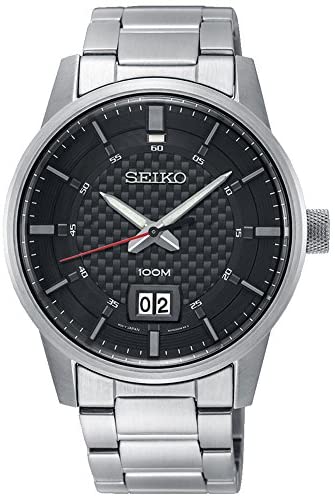Seiko mens watch. Silver stainless steel case Black dial. Quartz movement. Fold-over Clasp closure. Water resistance of 100 meters.