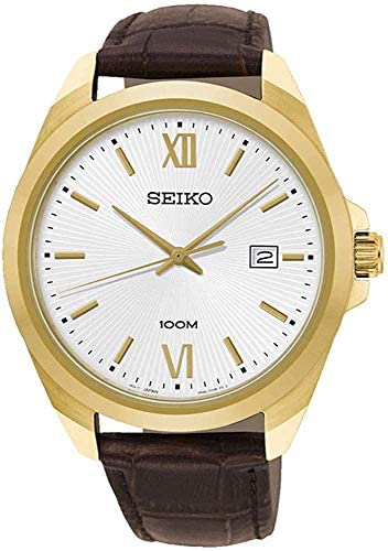The by Seiko is a timeless piece for those who value the little luxuries in life. This watch is handcrafted with a sleek leather band and stainless steel case. These durable materials guarantee longevity of the product and a proud owner in the years to come. The brown band, silver dial and gold hands contribute to the overall appearance of the watch by adding a sophisticated aspect. This piece also features a sturdy hardlex crystal to protect the dial and a japanese quartz movement to ensure you remain punctual in your daily life. In addition, this product is water-resistant to 100 meters / 330 feet / 10 atm , which is ideal for those days where an accident may occur. The rich details, imperishable components and luxurious quality of the Seiko watch make it a perfect addition to any collection.