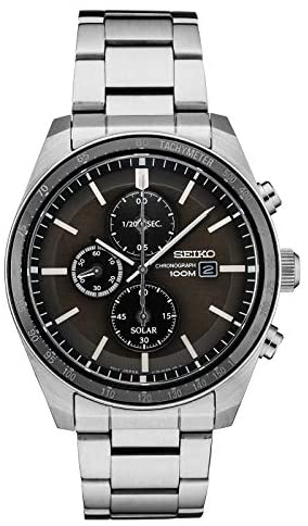 From the men’s essential collection. Designed for all-day action and style, this versatile solar chronograph is crafted of stainless steel with black ion-finish tachymeter bezel and secure screwdown case back. The rich gray dial, with three chronograph Sub dials, features a date calendar, as well as lumibrite hands and markers. Offering timing to 60 minutes in 1/20-second increments, the chronograph function includes split time measurement. The energy-efficient solar cell, powered by any light source, with no battery change required, provides a 6-Month power reserve when fully charged. 10 bar, 100 m Water resistant
