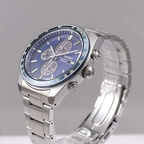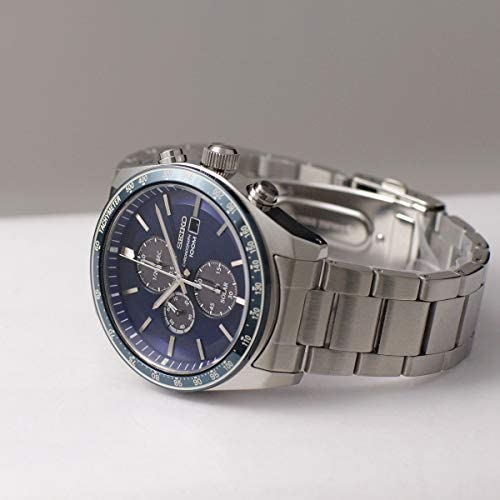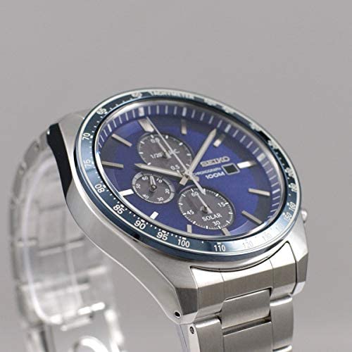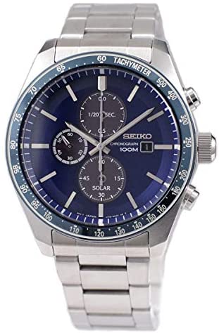 Seiko mens watch. Silver stainless steel case Blue dial. Solar movement. Fold-over Clasp closure. Water resistance of 100 meters.